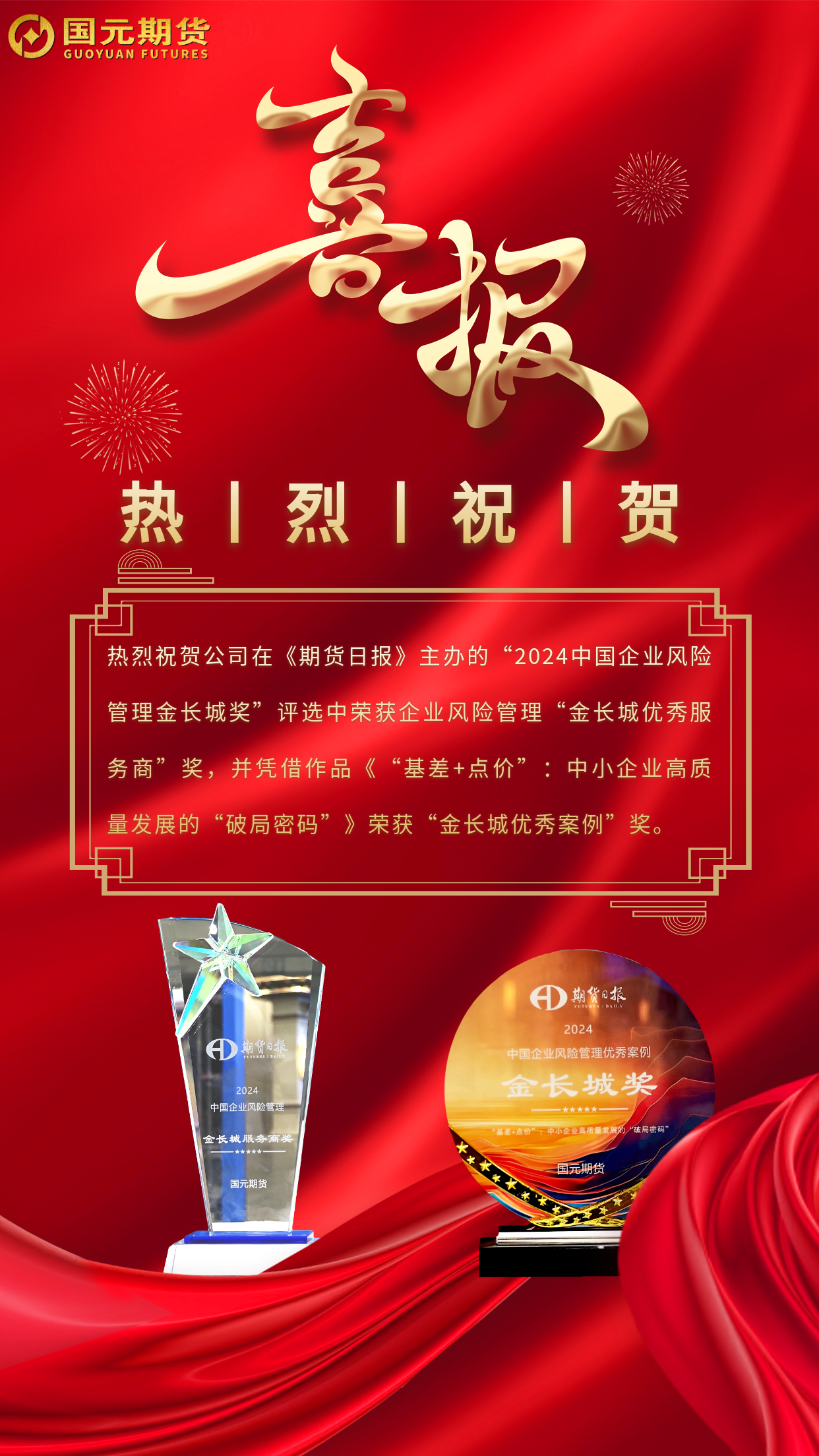 近日,在由《期货日报》主办的2024中国企业风险管理“金长城”奖颁奖典礼上,国元期货有限公司(一下简称“国元期货”)凭借其出色的综合实力与专业服务能力,一举斩获“中国企业风险管理金长城服务商奖”,研究咨询部张霄撰写的《“基差+点价”:中小企业高质量发展的“破局密码”》荣获“2024中国企业风险管理优秀案例金长城奖”。这两项荣誉不仅是对国元期货在风险管理领域创新实践的高度认可,也标志着国元期货在服务实体经济、助力企业稳健发展方面展现了积极的行业探索。